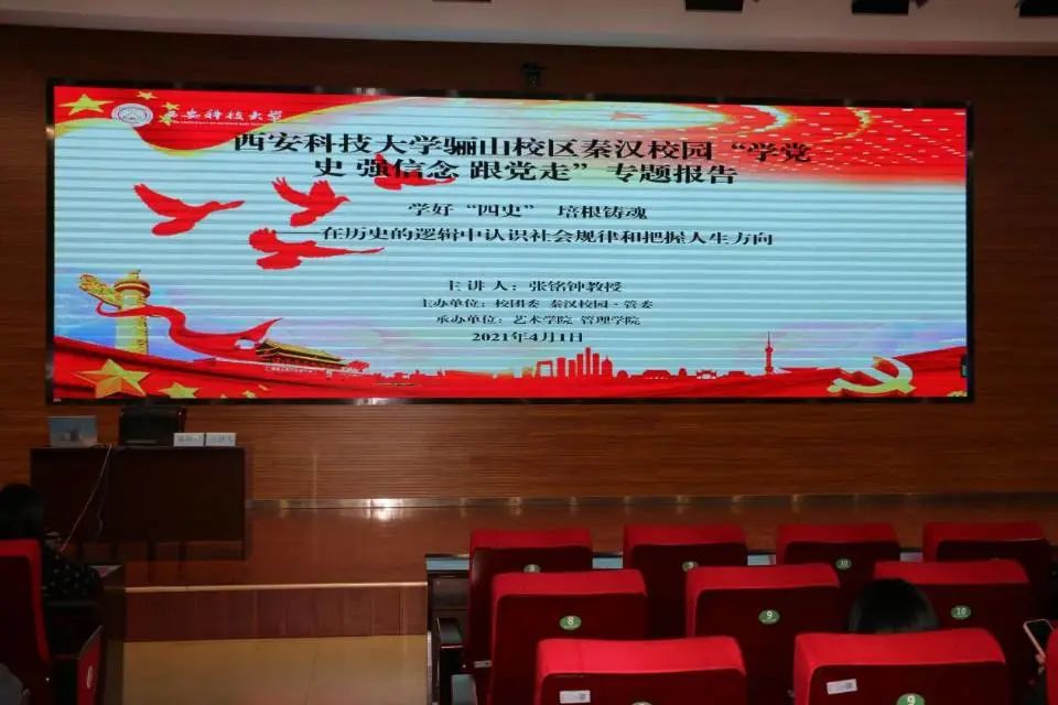 4月1日,由校团委、秦汉校区管委会主办,艺术学院、管理学院承办的“学党史、强信念、跟党走”专题报告会在临潼校区秦汉校园报告厅举行,同时在骊山校园煤炭二楼报告厅设分会场同步直播。必赢官网纪委书记、副院长张铭钟教授做了题为《学好“四史”培根铸魂——在历史的逻辑中认识社会规律和把握人生方向》的报告,两校园共计500余人聆听了此次报告。