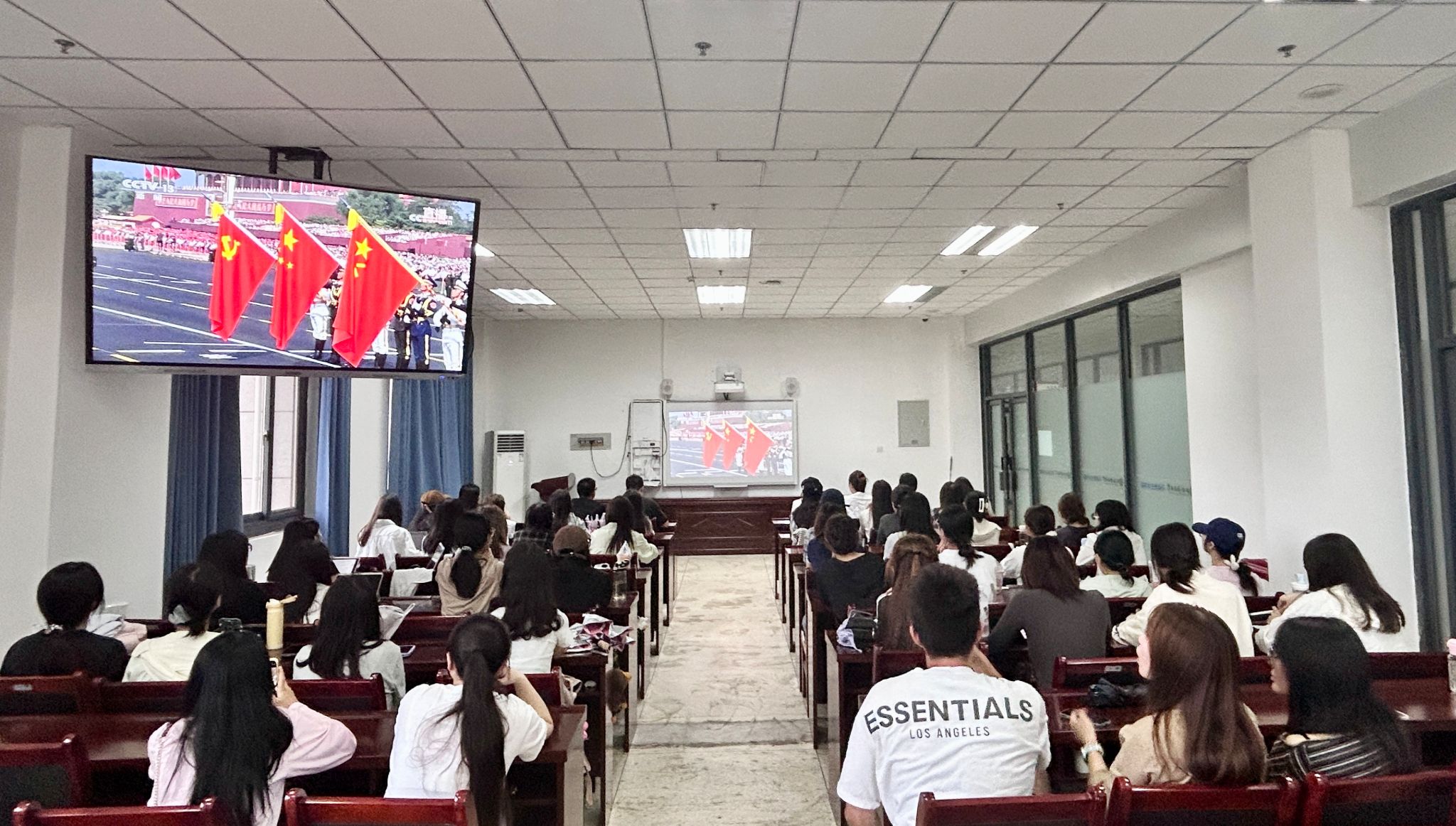 上午9时,阅兵仪式直播开始。会议室内气氛庄重而热烈,全体学生起立齐唱国歌。直播画面中,护旗方队迈着铿锵有力的步伐护卫国旗前行,每一步都踏响历史的回响;受阅官兵以严整的军容、昂扬的斗志展现新时代军人的铁血担当;自主研发的新型装备方阵次亮相,彰显我国国防科技的跨越式发展。一幕幕振奋人心的场景,让全体学生的自豪感与使命感在心中激荡。