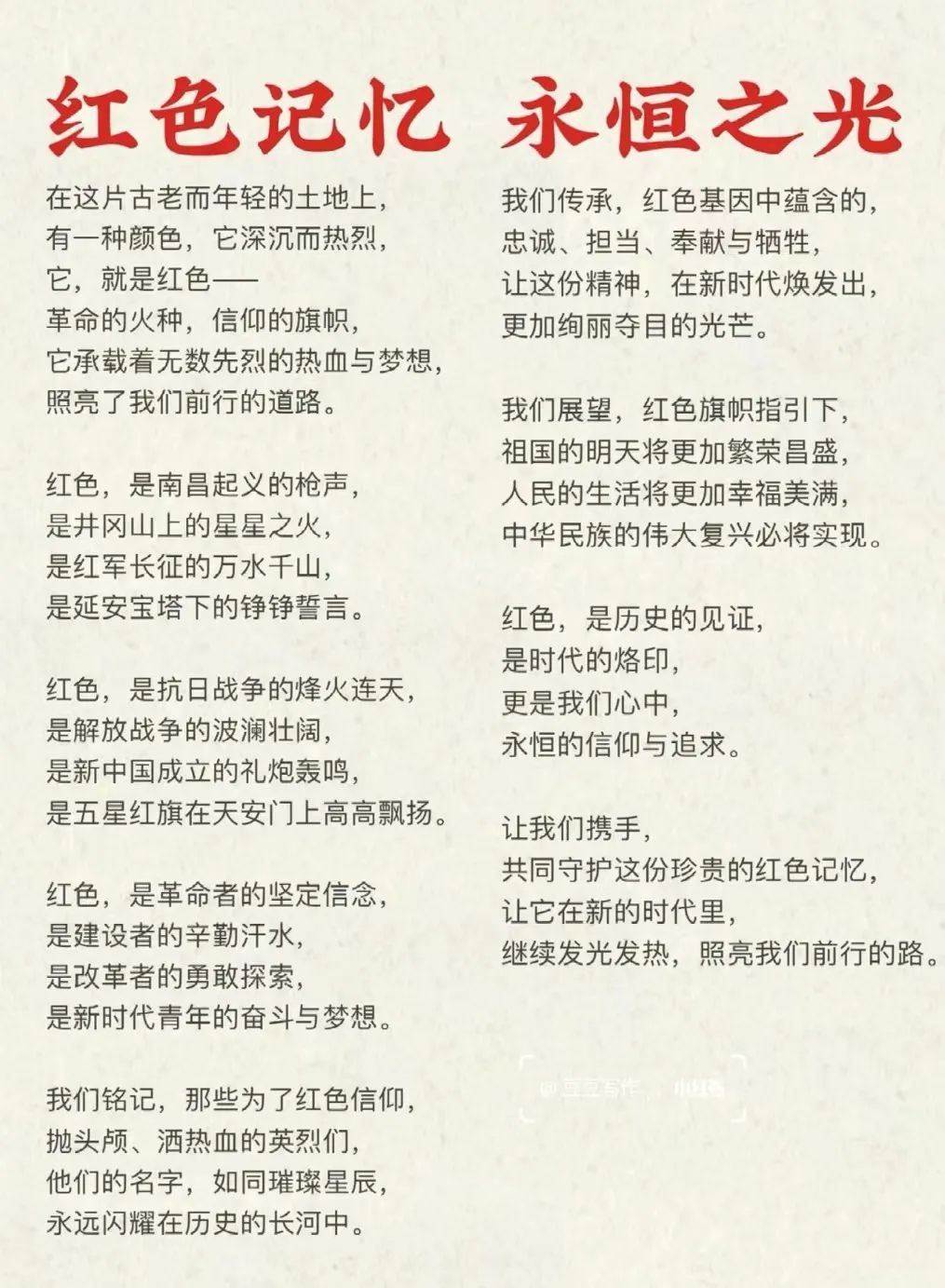 在朗诵中,我们仿佛穿越时空,回到了南昌起义的枪声响起时,看到了井冈山上的星星之火,感受到了红军长征的万水千山,以及延安宝塔下的铮铮誓言。这些历史的见证,如同璀璨星辰,照亮了前行的道路,也点燃了我们心中的红色火焰。