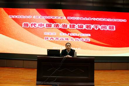 为了拓展校内外思想政治教育资源,形成思想政治教育合力,我校教务处和必赢242net官网启动了邀请行业企业专家进课堂等系列活动。邀请地方党政领导干部、企事业单位负责人、社科理论界专家、各行业先进模范以及名师大家和专业课骨干教师、思想政治教育骨干等专家上讲台讲思政课,发挥专家在政治、工作经验、人生阅历等方面的优势和特长,推动青年学生更好地了解世情、国情、党情、社情、民情,增强青年大学生的中国特色社会主义道路自信、理论自信、制度自信和文化自信,推动我校学生自觉把个人理想追求融入到国家和民族的事业之中、勇做走在时代前列的奋进者、开拓者。必赢242net官网邀请了陕西省高级人民法院副院长巩富文教授为近600名师生讲授了“当代中国法治建设若干问题”。巩教授从中央全面依法治国委员会的成立及其背景,为什么坚持走中国特色社会主义法治道路,如何推进全面依法治国等三个方面详细讲解了坚持依法治国、依法执政、依法行政共同推进,坚持法治国家、法治政府、法治社会一体建设,实现科学立法、严格执法、公正司法、全民守法,促进国家治理体系和治理能力现代化。