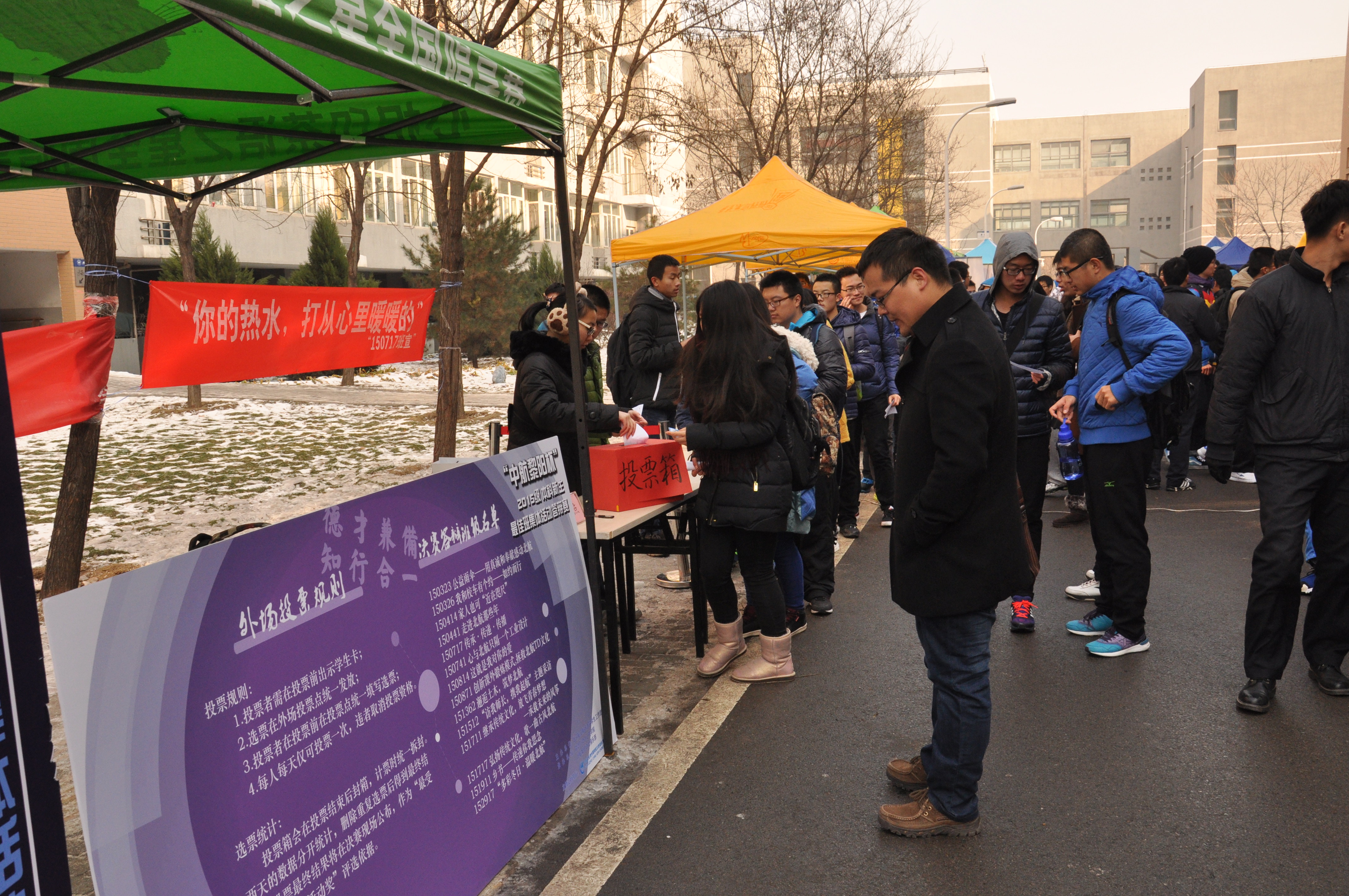 在本次比赛外场宣传活动中,每个班级都以蓬勃朝气彰显青春活力,用满腔热血弘扬“北航四爱”。在1、4号学生公寓之间的马路上,激情澎湃的口号声使得现场气氛热烈非凡。横幅与海报诉说着班级活动的点点滴滴,使同学们体会到了班集体活动的魅力。同学们纷纷驻足观看,置身于青春与激情的海洋。在外场展示中,参赛班级选取了丰富多彩的形式,向同学们介绍本班活动主题及内容,邀请同学们参与小游戏并赠送纪念品,部分班级还贴心地为同学们提供热饮。同学们根据展示内容进行投票,外场投票结果将与线上投票结果结合,产生本届最受欢迎班集体活动奖。