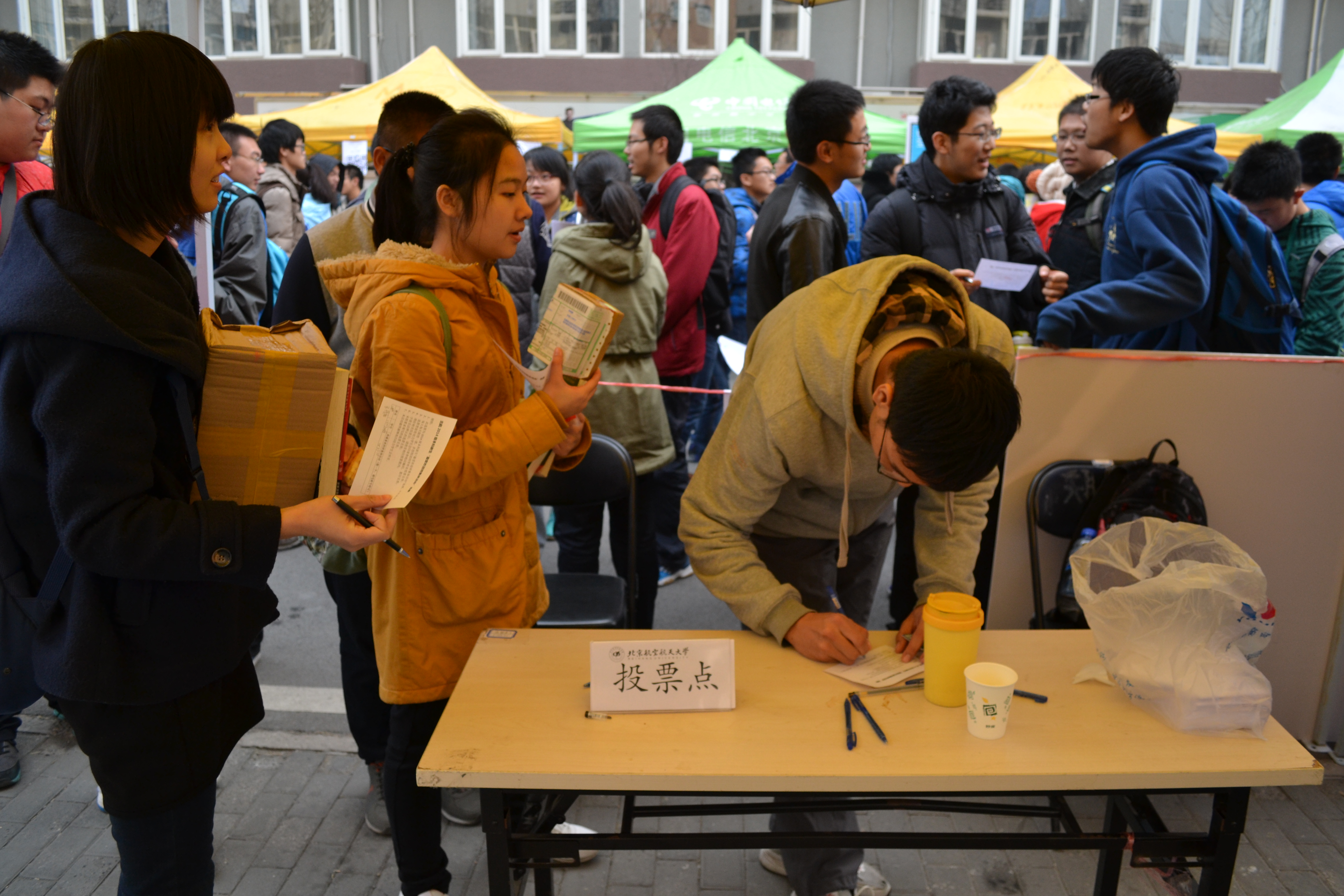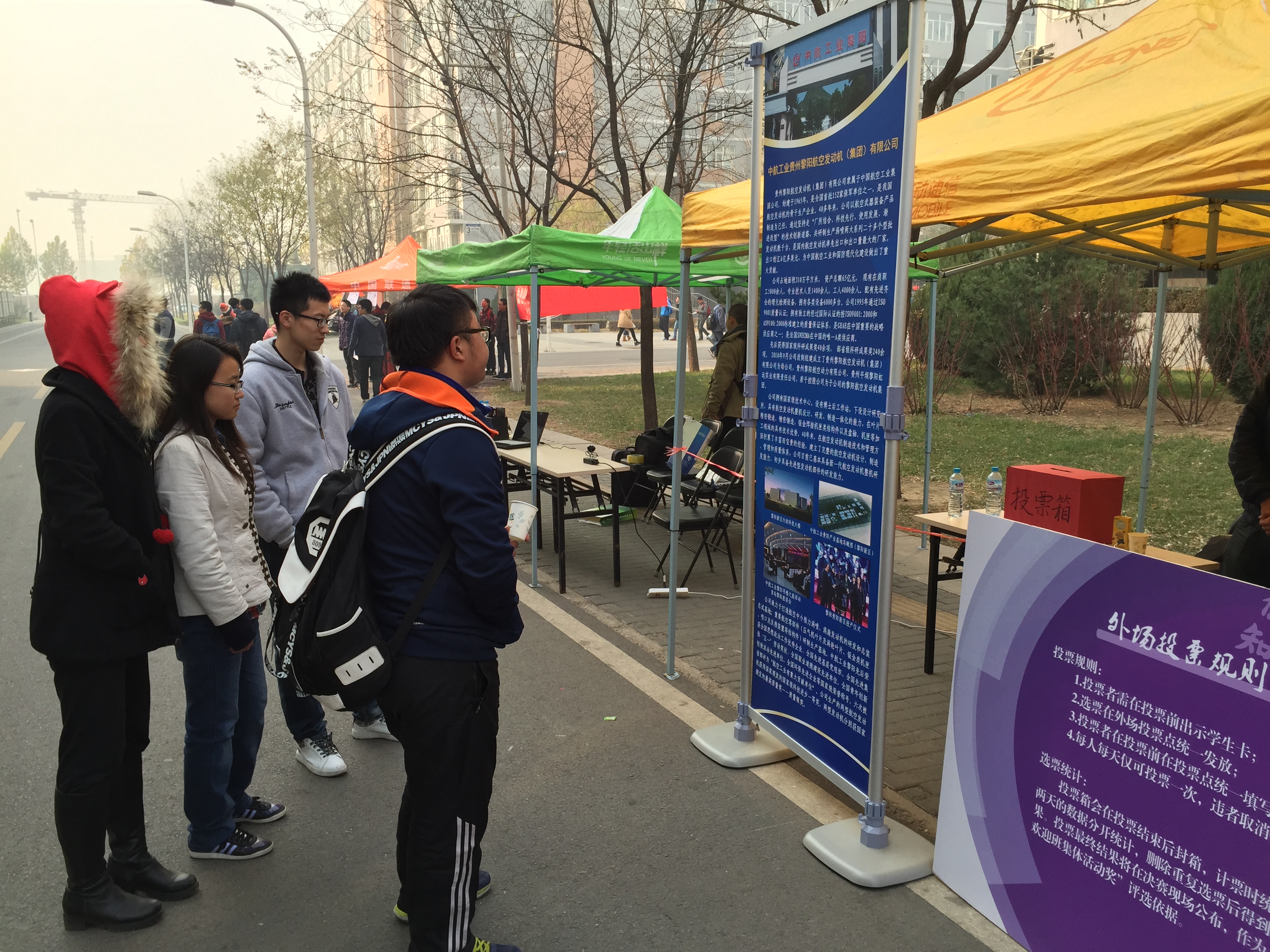 在本次比赛外场宣传活动中,每个班级都以蓬勃朝气彰显青春活力,用满腔热血弘扬“北航四爱”。在1、4号学生公寓之间的马路上,激情澎湃的口号声使得现场气氛热烈非凡。横幅与海报诉说着班级活动的点点滴滴,使同学们体会到了班集体活动的魅力。同学们纷纷驻足观看,置身于青春与激情的海洋。在活动内容上,有以心理健康为主题,主张缓解大学生心理压力的;也有以校园改进为主题,计划BICYCLE整理的等等。道路两侧的投票点,井然有序,为广大学生选择自己喜爱的班级活动提供了良好的平台。宣传活动期间我们用航拍记录全景,用照片铭刻瞬间,将一份份绚烂珍藏。