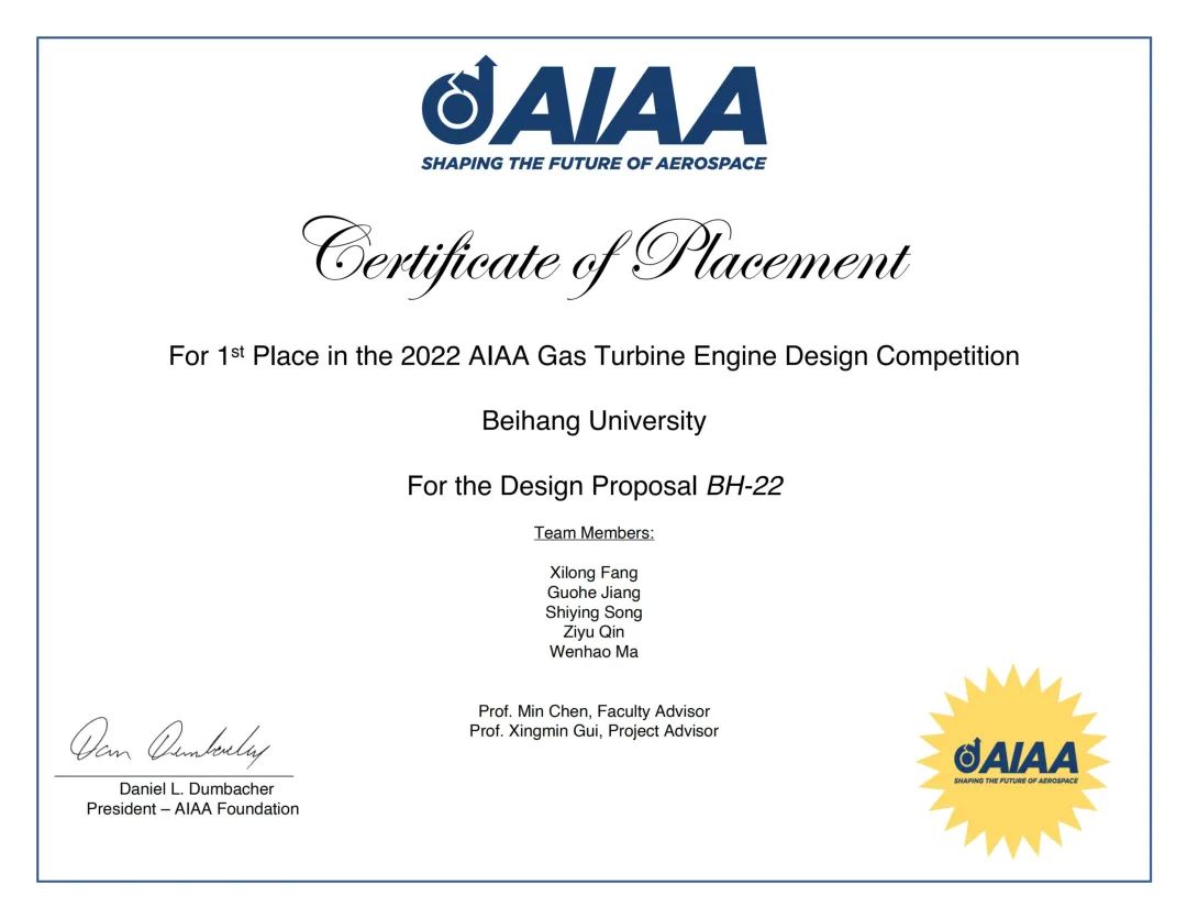2022年10月17日,北航动力学院2018级本科生方玺龙、姜国河、宋世英、覃子宇、马文豪在指导教师陈敏教授、桂幸民教授的精心指导下,经过6个月的辛苦准备,在美国航空航天学会American Institute of Aeronautics and Astronautics(AIAA)国际本科生航空发动机设计大赛中获得冠军,这是自2017年以来,北航学子在此项赛事中第三次闯入决赛,第二次获得冠军。