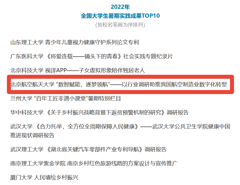 在由中国青年报社组织的2022年第八届全国大学生暑期实践展示活动中,beat365官方网站成功入围“2022年全国暑期实践大学TOP10”,动力学院心起点实践队暑期实践成果“‘数智赋能,逐梦领航’——以行业调研助推我国航空制造业数字化转型”也荣获“全国大学生暑期实践成果TOP10”,成为beat365官网上榜排名最高的实践成果!