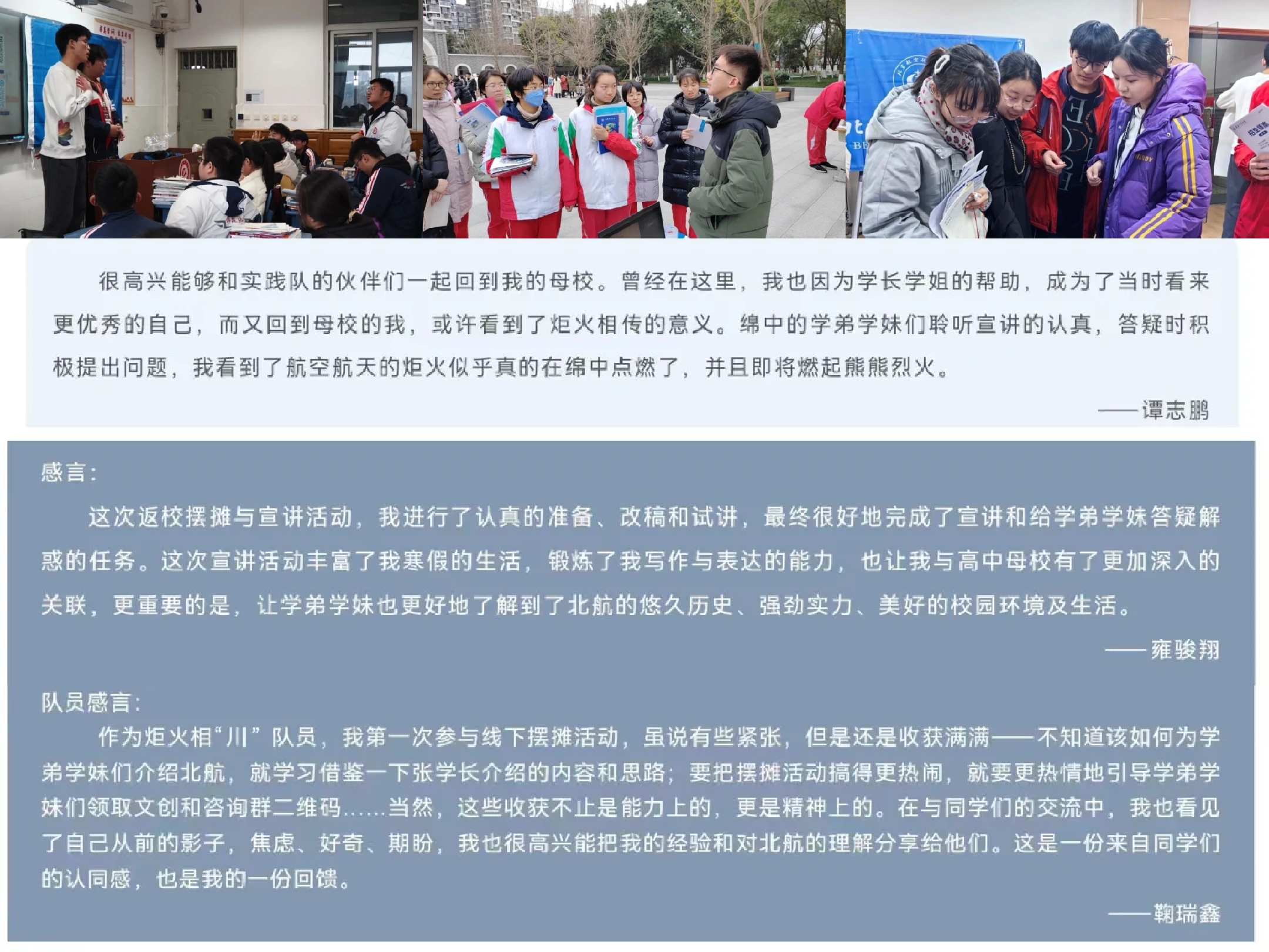 广义招生的另一核心,即作为北航宣传者,宣讲者,我们不止要讲北航有什么,还要讲北航人怎么样,北航精神是什么。本次寒假,炬火相“川”实践队着重开展“空天报国,敢为人先”的空天文化,空天精神的讲述,做出不一样的航空科普。