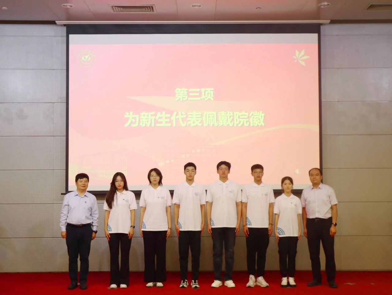 学院领导老师为新生代表授予院徽,鼓励动力学子们在未来人生路上,不忘初心,矢志前行。全体新生同步佩戴院徽,正式成为动力学院的一员。