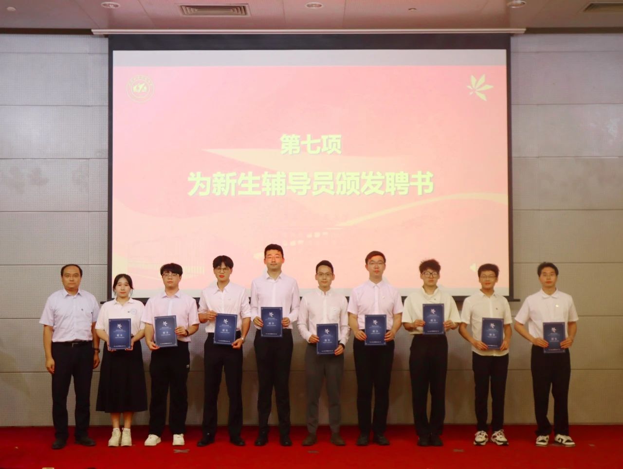 学院党委副书记谷萌宣读新聘任辅导员名单,党委书记董卓宁为新聘任辅导员颁发聘书。从学生到辅导员,从沿路到领路,昔为学子步书廊,今作园丁育栋梁。