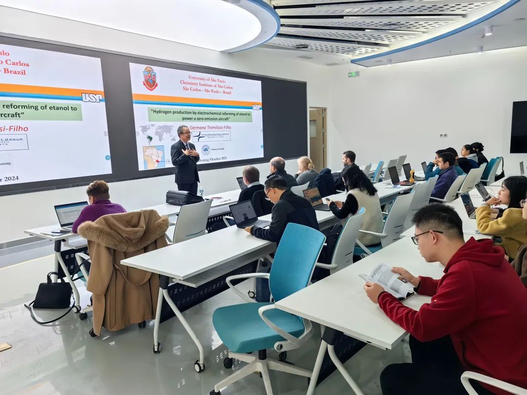本次活动邀请了巴西圣保罗大学圣卡洛斯化学研究所Germano Tremiliosi-Filho教授和Agnieszka Maule教授,巴西圣卡塔琳娜州立大学Luis Fontana教授和新加坡国立大学的Daniel Chua教授,他们分别就电化学重整在线制氢、航空节能电致变色智能窗、等离子体真空镀膜等前沿技术研究为北航师生做了精彩的学术报告。动力学院邱璐副院长代表学院致欢迎辞并宣布启动北航“国际航空氢能周”系列活动,刁训刚教授主持学术讲座。学院师生积极参与,与多位与会外籍专家就相关议题进行了深入而富有成效的讨论。会场内气氛热烈,学术探讨氛围浓厚,成果丰硕。