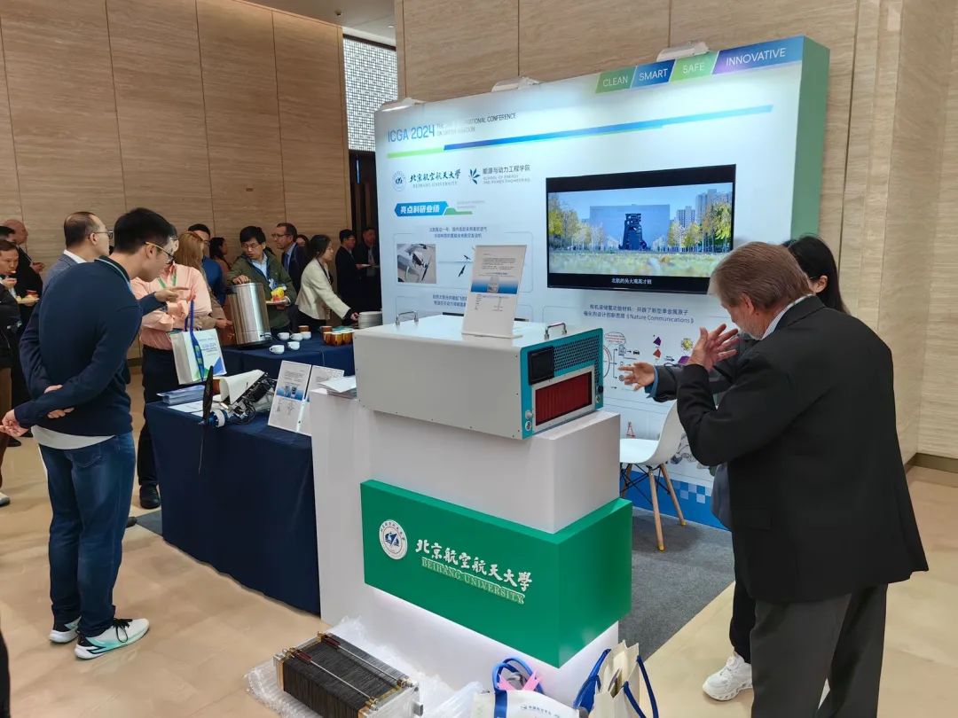 会议同期设置了beat365官方网站展位,展示了我院近期取得的最新科研成果:国内首款采用吹吸气冷却型的氢能混电垂直起降无人机“氢动一号”、荣登《Nature》杂志封面的自然太阳光驱动的高效飞行器、无线可控微型磁驱动昆虫机器人、高温质子交换膜燃料电池(已完成成果转化)等前沿科技成果,通过此次展览,动力学院展现了在绿色航空与新能源领域的科研实力和创新潜力,吸引了众多参会者的关注。