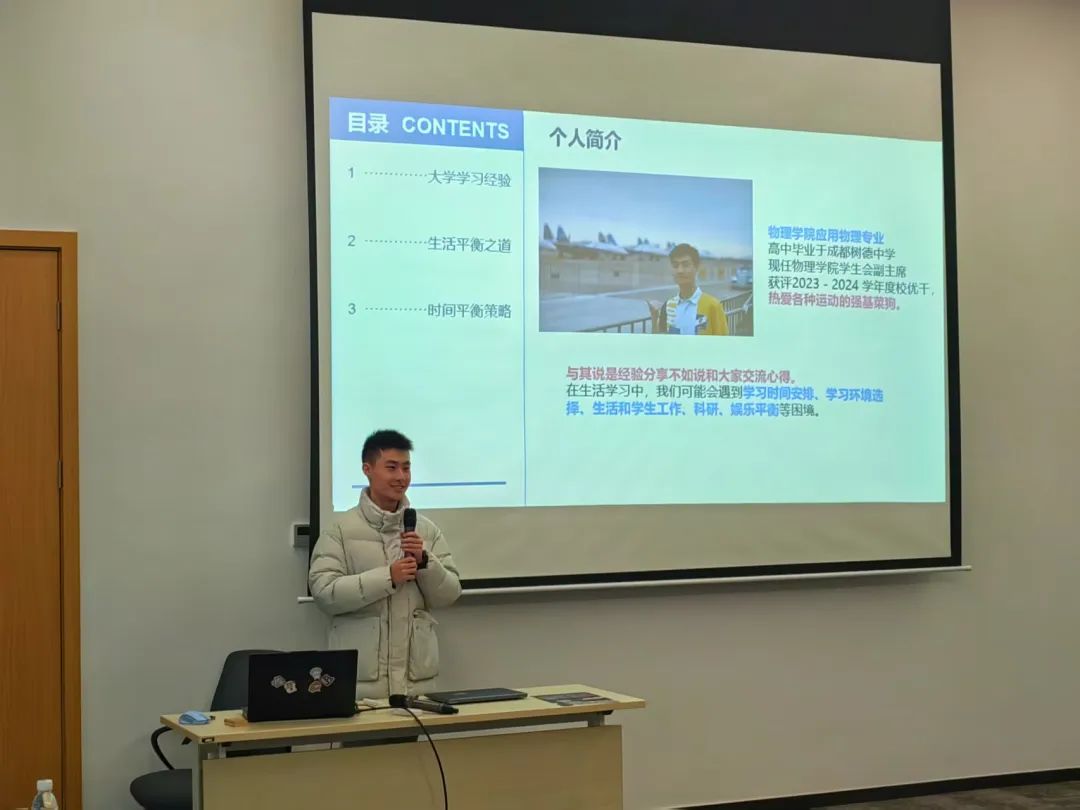 来自物理学院2023级应用物理学强基计划的易睿诚,向大家介绍了学习方法和生活平衡之道。他总结出“没有最好的(环境、资源),只有最适合自己的”的规律。面对大学学习,他强调首先要有自信,从心态到学习方法都要有全方面的自信。其次,应转变应试思维模式以适应新的环境,我们要善用学校提供的慕课平台、学术数据库等资源建构立体化学习体系。在生活平衡之道中,易学长介绍了两个中心思想:规律性和优先级。规律性本质是“用确定性对抗不确定性”,在动态环境中构建个人的“时间护城河”。优先级管理的本质是资源分配策略,需以价值为导向进行取舍。利用“四象限法则”,定期复盘,最大限度实现自己的所有需求。规律性与优先级并非孤立存在。规律性为优先级提供执行载体,优先级为规律性注入方向性,二者结合的关键在于动态平衡。