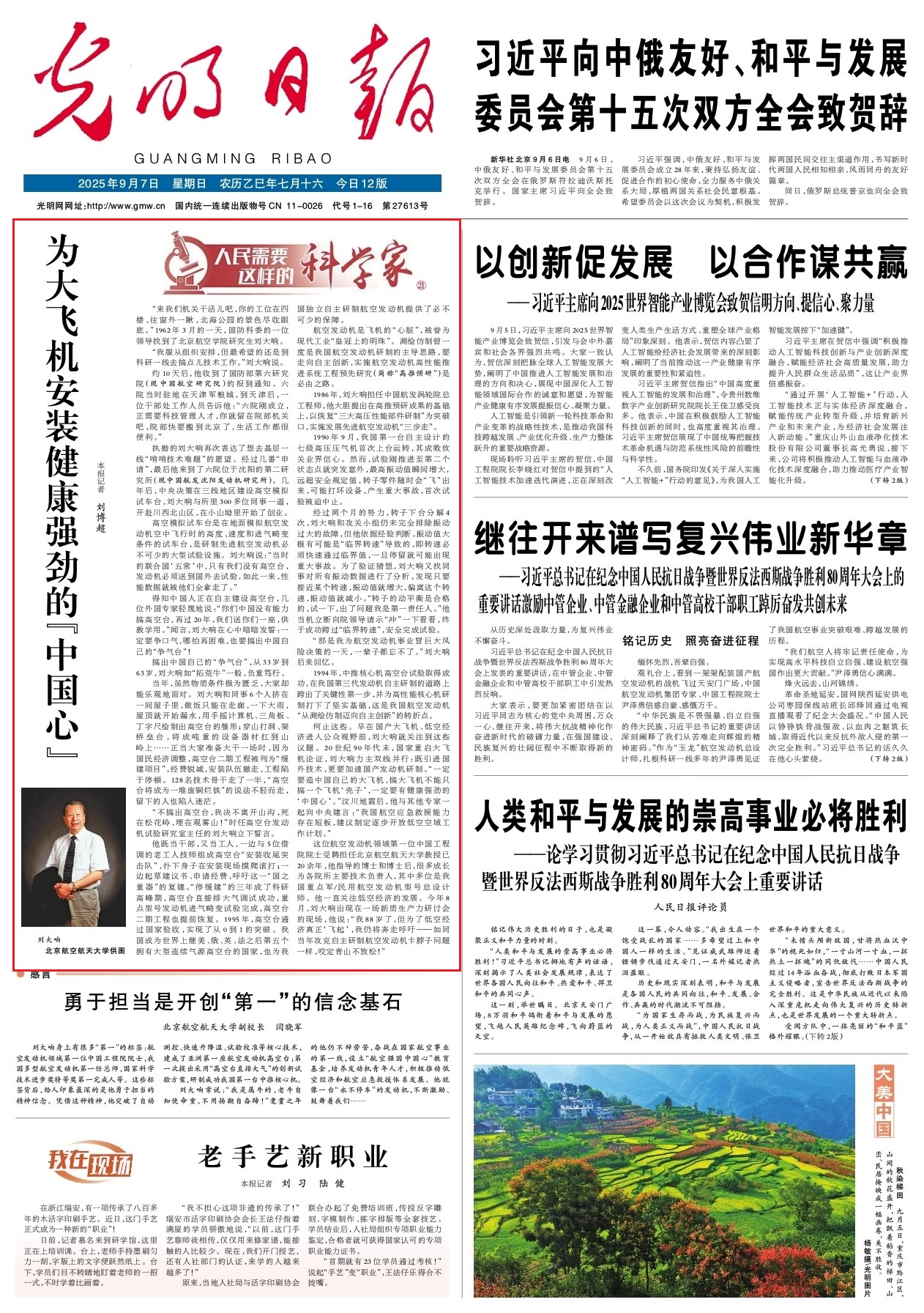 《光明日报》头版头条【人民需要这样的科学家】栏目刊发beat365官网刘大响院士事迹文章:为大飞机安装健康强劲的“中国心”。