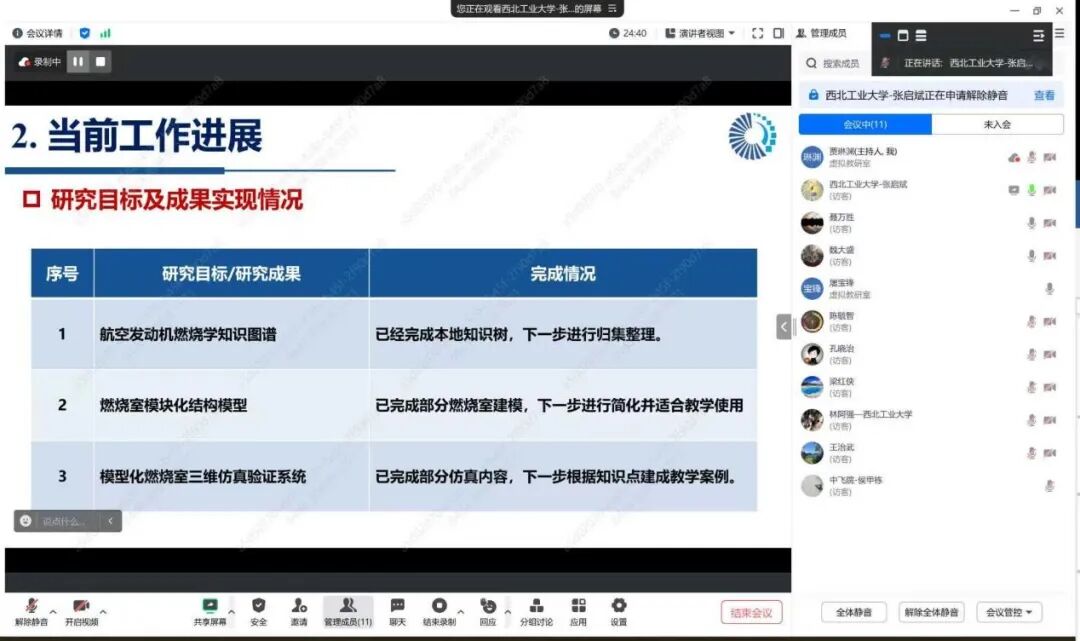 评审过程严格遵循汇报、提问、反馈的流程,各组专家围绕项目进展与申请书目标匹配度、成果实用性与推广价值及后续研究可行性三大核心维度提出建议,秘书全程记录评审意见,形成个性化反馈。 中期检查40余个教改项目,内容覆盖航空发动机原理、燃烧学、传热学等核心课程,涉及 AI 赋能、知识图谱、虚实融合等前沿教学技术,展现出航空动力类课程教改的多元化探索方向。