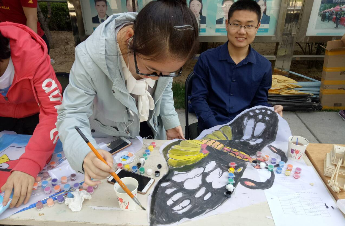 在制作风筝与手绘个性风筝部分,同学们纷纷拿起画笔,将自己喜欢的图案、想说的话写在风筝上面。然后在工作人员的帮助下将风筝扎起来,创造出了许多充满新意的有趣风筝、比如蝴蝶风筝、小黄人风筝等。