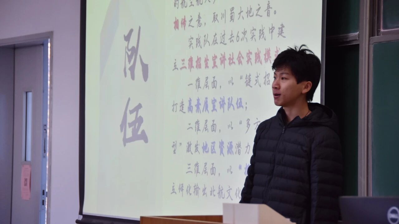 炬火相“川”实践队队长瞿综向同学们介绍实践队并作招新宣传。炬火相“川”实践队成立于2022年,以“寻找‘蜀’于我们的航空航天梦”为宗旨,立炬火相传之意,取川蜀大地之音。三年以来,实践队获得2023暑期社会实践校级三等奖、院级二等奖,2024寒假社会实践院级二等奖、2024暑期社会实践校级二等奖、院级一等奖,2025寒假社会实践校级二等奖、院级一等奖等多项荣誉,并在6次实践中建立起三维招生宣讲社会实践模式。着眼于寒假实践,实践队将继续推进三维实践模式的计划实施,也将持续联动关系紧密的各个合作伙伴,为2026届高考生以及各年级在校生开展多样活动。同时,实践队还将聚焦科普教育,开展线上线下科普课堂,为各年龄段的同学提供科普教育。
