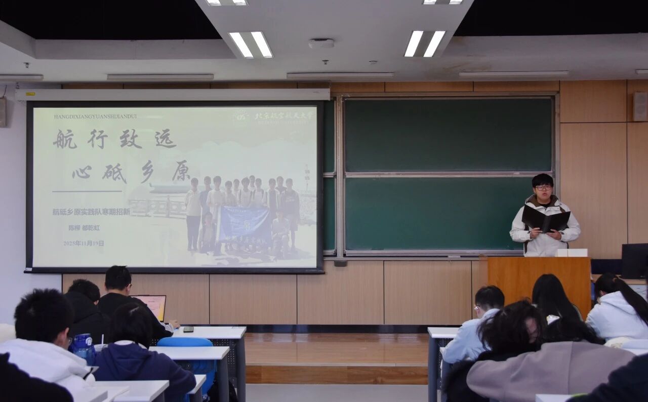 航砥乡原实践队队长陈柳向同学们介绍实践队基本情况并作实践队招新宣传。实践队在2025年暑期实践首次出发,围绕“以产业振兴带动乡村振兴”主题,扎根河南基层展开深入调研,获评院级优秀实践队三等奖。本次寒假实践,实践队聚焦于“履践致远,踏雪燃薪”,结合往次经验,拓展支教支队、增加实践地点,为乡村振兴贡献北航青年的力量。