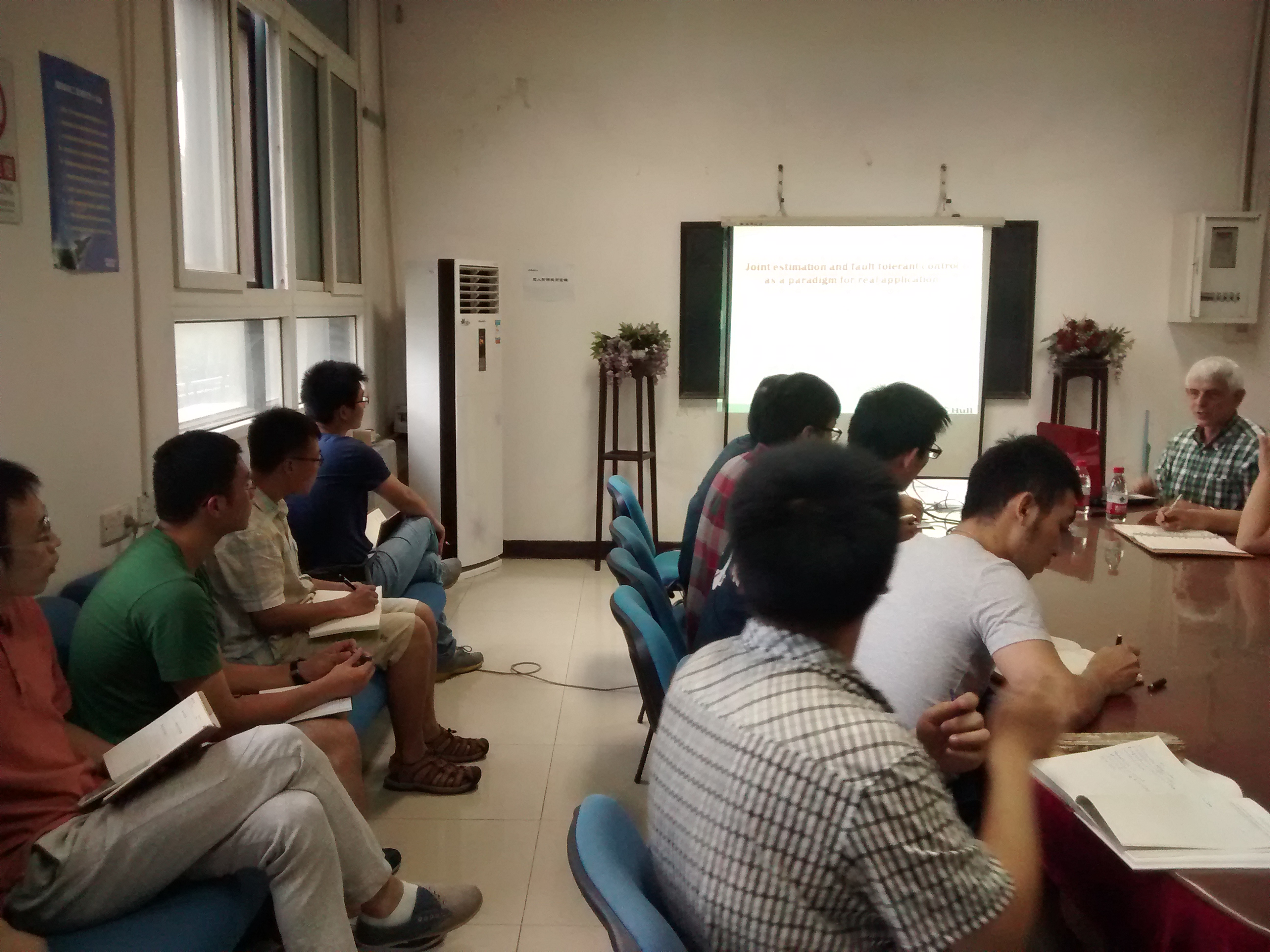 在当天的报告会上,Patton教授以《Joint estimation and fault tolerant control as a paradigm for real application》为题,作了近3个小时的学术报告,以故障诊断和容错控制的应用实例为切入点,为beat365官网师生介绍了将优秀的容错控制性能和鲁棒设计相结合的设计过程,详细描述了故障诊断和容错控制的工程应用及未来的发展前景。报告内容深入浅出,在场师生认真聆听了学术报告,并积极地与Patton教授进行了关于各个专业领域里容错控制问题的学术讨论。其间,参会的研究生同学积极提问,Patton教授耐心回答同学们提出的各种问题,并语重心长的提醒现场的师生,不能纸上谈兵,要把学术问题放在实际应用中。在座师生被Patton教授幽默的谈吐风格、深厚的专业素养和广阔的专业视角所深深折服,并受益匪浅。