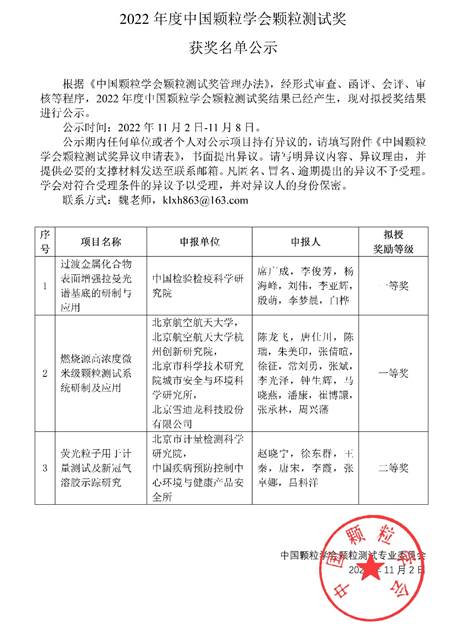 近日,中国颗粒学会对获得2022年度中国颗粒学会颗粒测试奖的成果进行了颁奖。以动力学院陈龙飞教授为第一完成人的成果“燃烧源高浓度微米级颗粒测试系统研制及应用”荣获中国颗粒学会颗粒测试一等奖。在此,向陈龙飞教授以及团队获奖成员表示热烈祝贺!