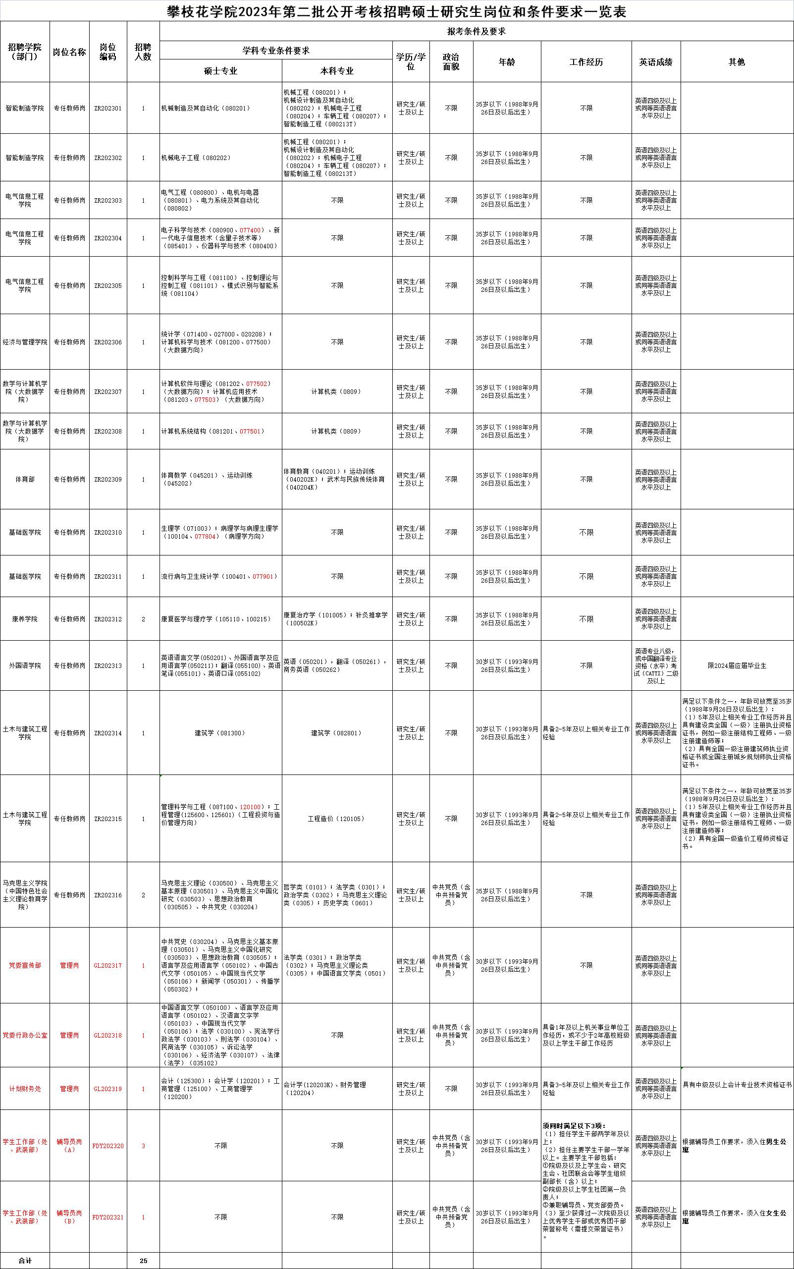 附件:1.攀枝花学院2023年第二批公开考核招聘硕士研究生岗位和条件要求一览表