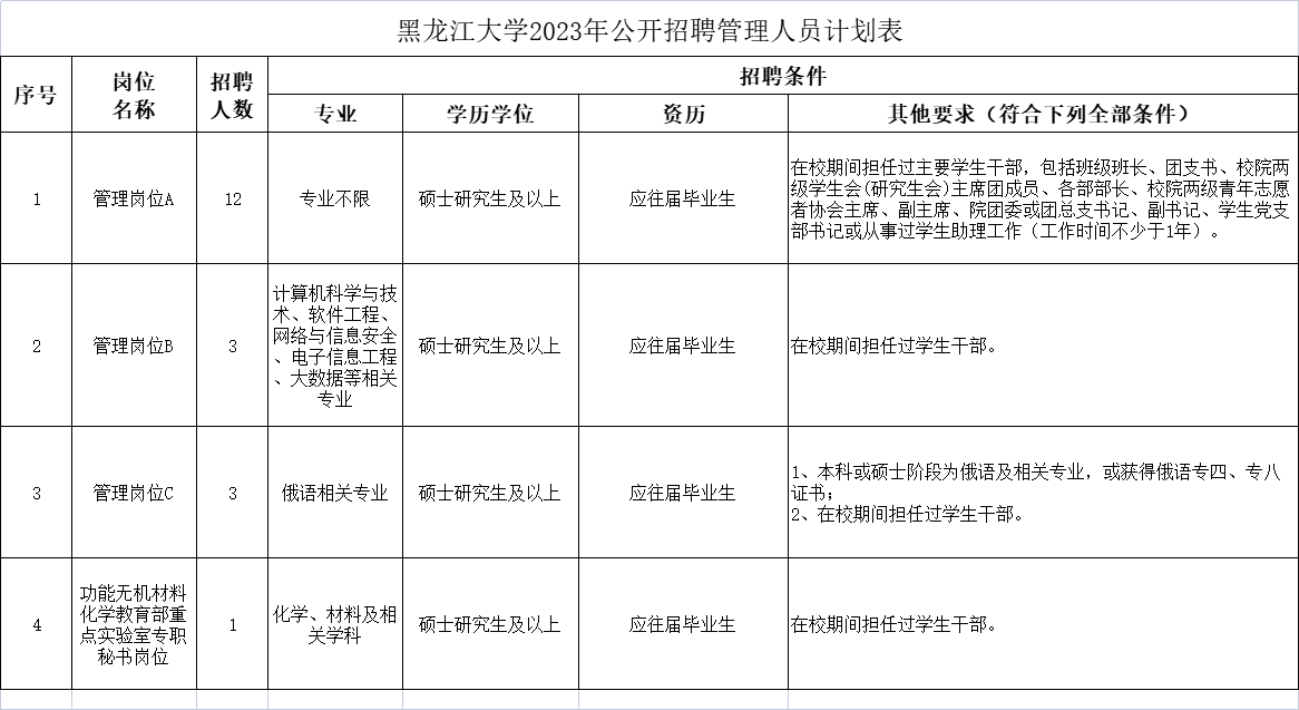 7.同时满足应聘岗位的其他要求,详见《黑龙江大学2023年公开招聘管理人员计划表》(附件1)。